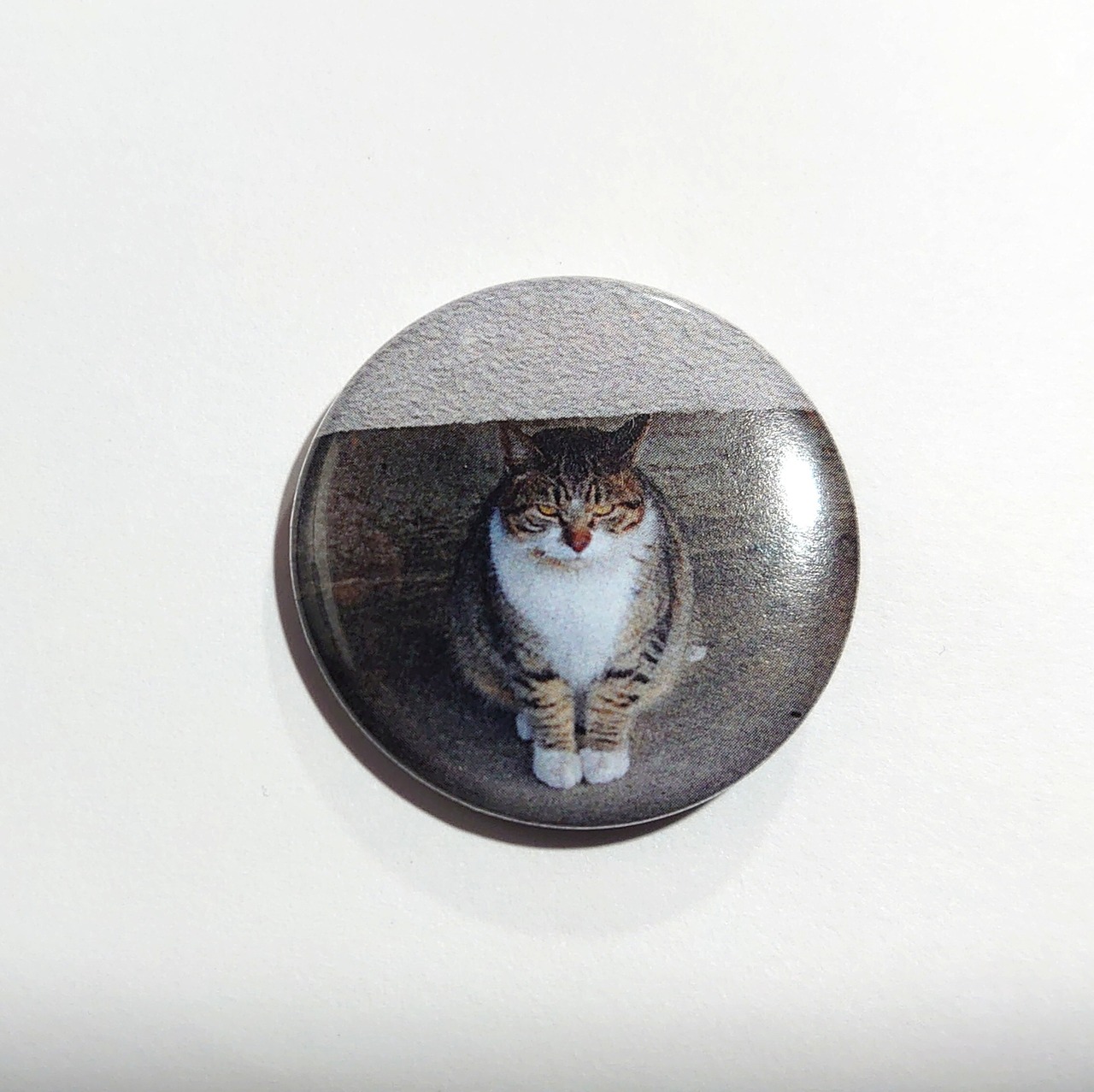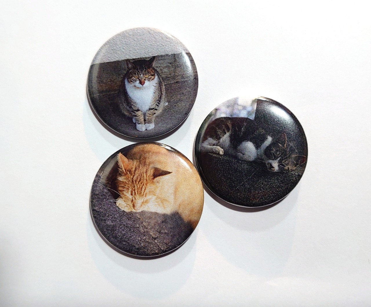 A badge with an original cat photo taken by Linda. It is a set of 3.